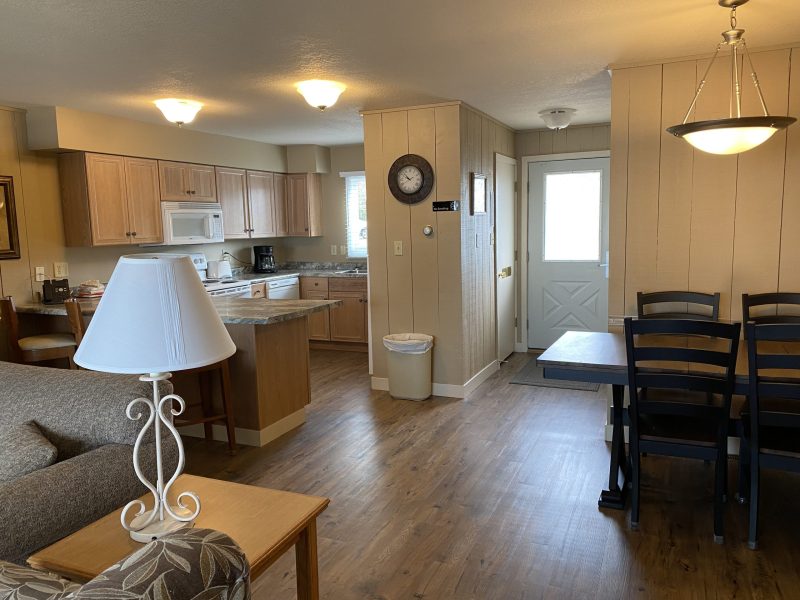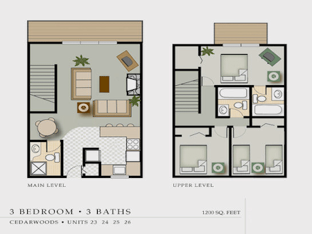 The Cedarwoods feature three separate bedrooms and two baths on the upper level. One bedroom has a king size bed, one has a queen and one has a set of twins. The main floor has a full bath, a living room with a hide-a-bed, air conditioning, gas fireplace, wi-fi, cable TV, Blu-Ray player, hair dryers, iron w/board, Weber charcoal kettle grill, telephones, lakeside deck and a large kitchen-dining area.