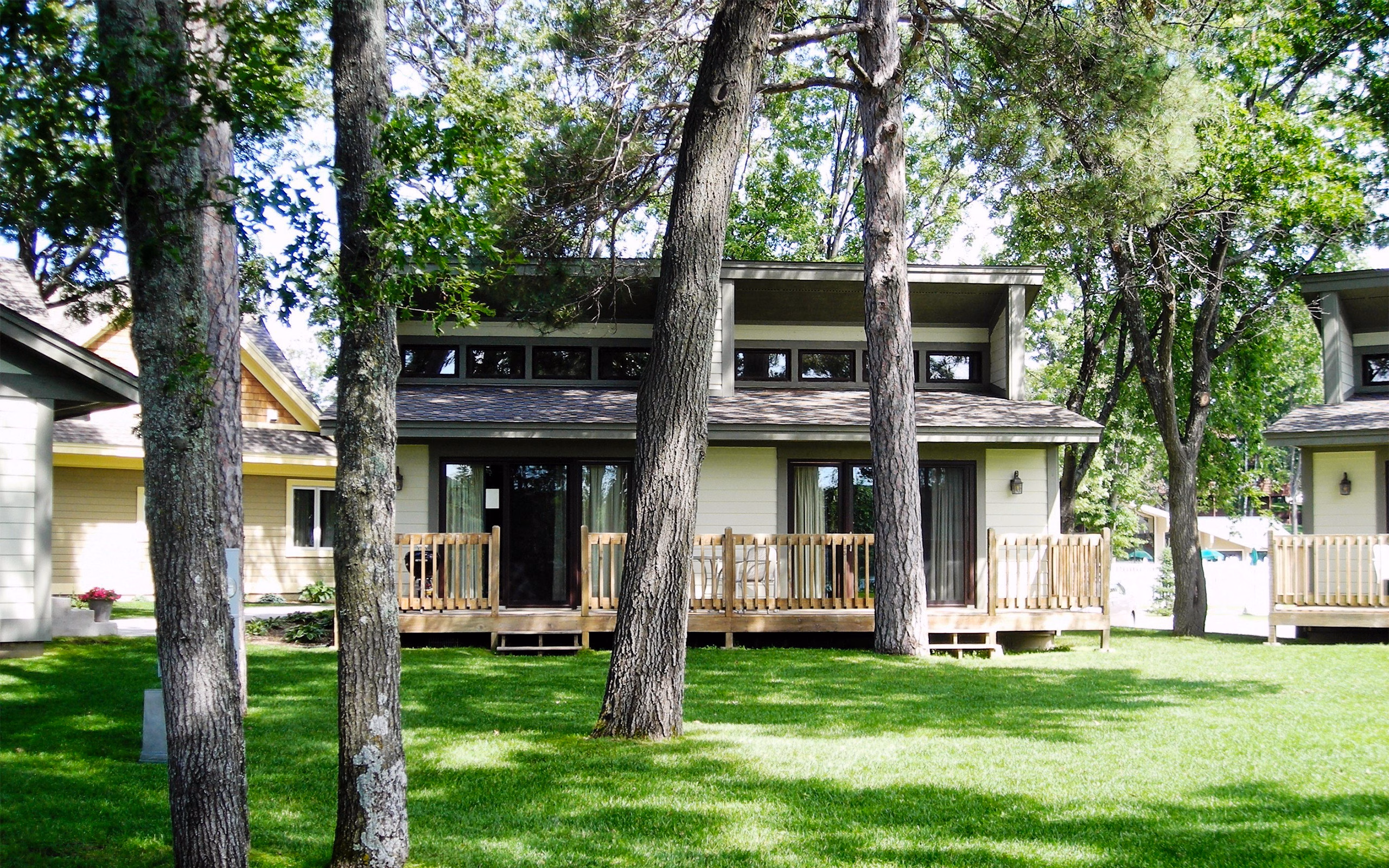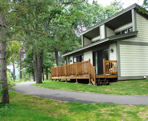 One bedroom individual cottages for 2-5 people. The Oaks have a king size bed, full bath, gas fireplace and twin size hideabed in the master bedroom, plus a separate dining area, kitchen and a living room with gas fireplace, queen hideabed, full bath, lakeside deck and washer/dryer. Units also have air conditioning, wi-fi, cable TV, Blu-Ray player, hair dryers, iron w/board, Weber charcoal kettle grill and telephones.